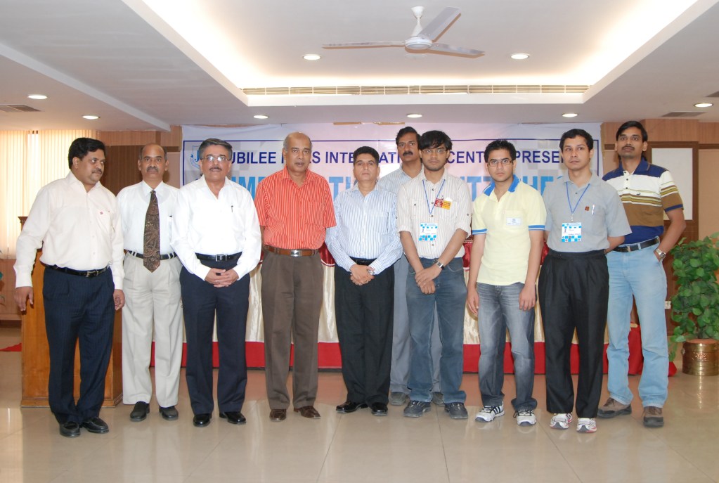 The National Blitz Chess Championship sponsored by the NMDC was organized by Cyber Chess Academy, under the auspices of the A.P. Chess Association at the sophisticated Jubilee Hills International Centre, Hyderabad on 5th June 2009. Around 50 players including 4 Grandmaster , 14 International Master and 4 FIDE Masters have participated in this scintillating event. The players were given three minutes each with additional time of 2 seconds for each move made . All the 11 rounds were played within a span of 6 hrs. The Tournament was inaugurated by Shri.S.N.Mohanty, Principal Secretary (Youth Advancement), and the NMDC trophy was unveiled by Shri.V.K.Sharma, Director Commercial, graced by Shri.D.Virinchi of SBH and Shri.Bandhakavi of NMDC and Sateesh of JHIC