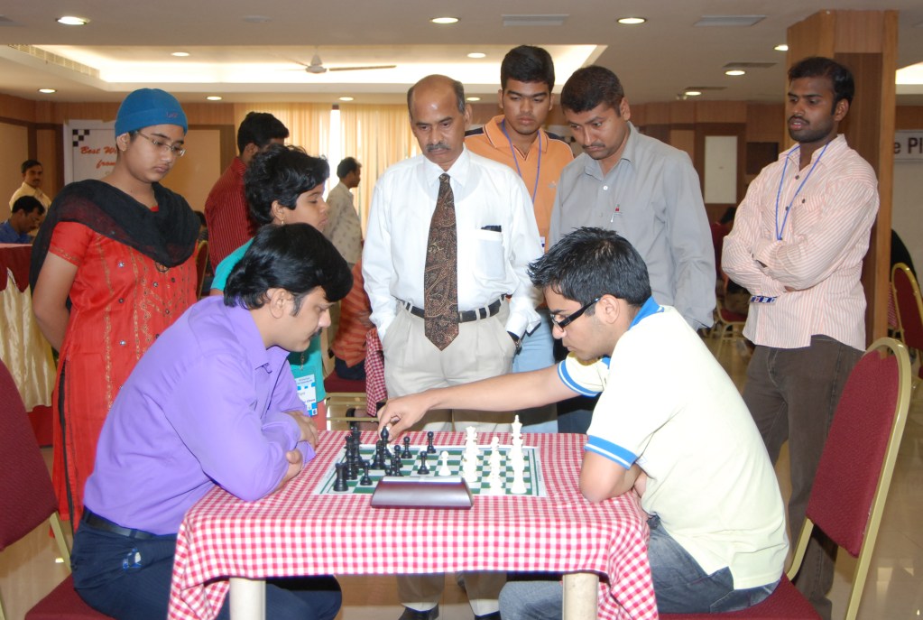 Photo: Ramakrishna of Andhra Pradesh fighting it out against Grand Master Parimarjan Negi during the National Blitz Chess Championship. Shri.Bandhakavi DGM of NMDC, takes keen interest to see the game along with several talented players of Andhra Pradesh.