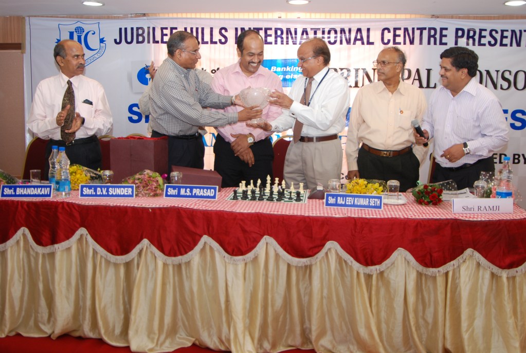 Shri.D.V.Sundar Secretary All India Chess Federation, hand overing the SBI Trophy to Shri.Rajeev Kumar Seth,SBI General Manager,Network1, Local Head Office, Hyderabad. Shri Bandhakavi NMDC DGM, Shri Ramji ONGC Regional Manager and International Master Lanka Ravi look on.